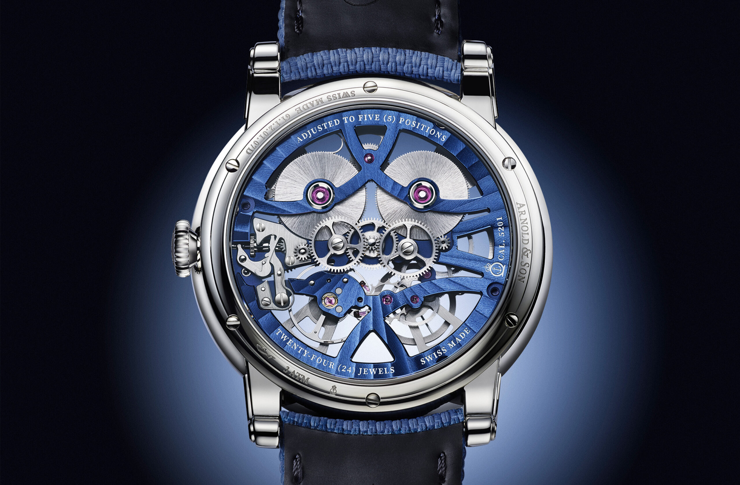 Harmonious, radiant and intense, Nebula’s skeleton movement reveals a structure in grey and blue tones. It combines steel with a PVD treatment on diametrically opposing bridges for a perfectly chic visual effect.