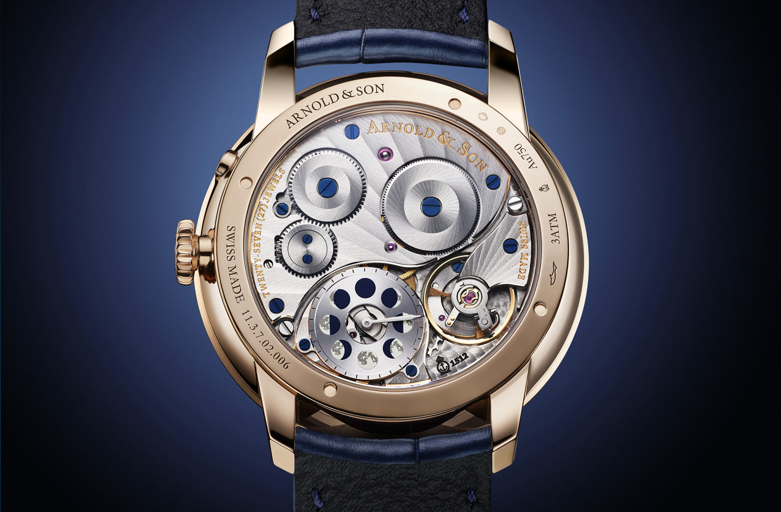 The astronomical moon phases showcase Arnold & Son’s creativity and aesthetic flair. Perpetual Moon 41.5 is presented in red gold or in platinum. Its dial features a unique motif, Stellar Rays, as befits this astronomical complication.