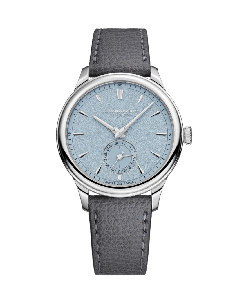 The L.U.C Quattro is powered by a hand wound mechanical movement featuring L.U.C Quattro technology with two sets of two stacked barrels, delivering an impressive power reserve of approximately 216 hours. The timepiece features a blue light PVD dial and is COSC certified, while also bearing the prestigious Poinçon de Genève quality hallmark. Its functions include hours, minutes, small seconds at 6 o’clock, a power reserve indicator, and a hand type calendar. The watch is protected by a glareproofed sapphire crystal and is fitted with an interchangeable strap with a gold buckle.