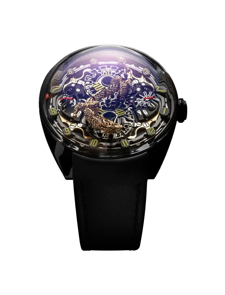The domed sapphire crystal further enhances the magnificence of the dragon, allowing enthusiasts to marvel at its splendor as it gracefully moves across the face of the watch to indicate the time. The piece unique GENUS GNS Dragon Black PVD Titanium SHH Edition proudly stands as the first dragon with ruby gem-set eyes, each ruby carefully selected and cut to seamlessly integrate into the shape of the dragon's head.