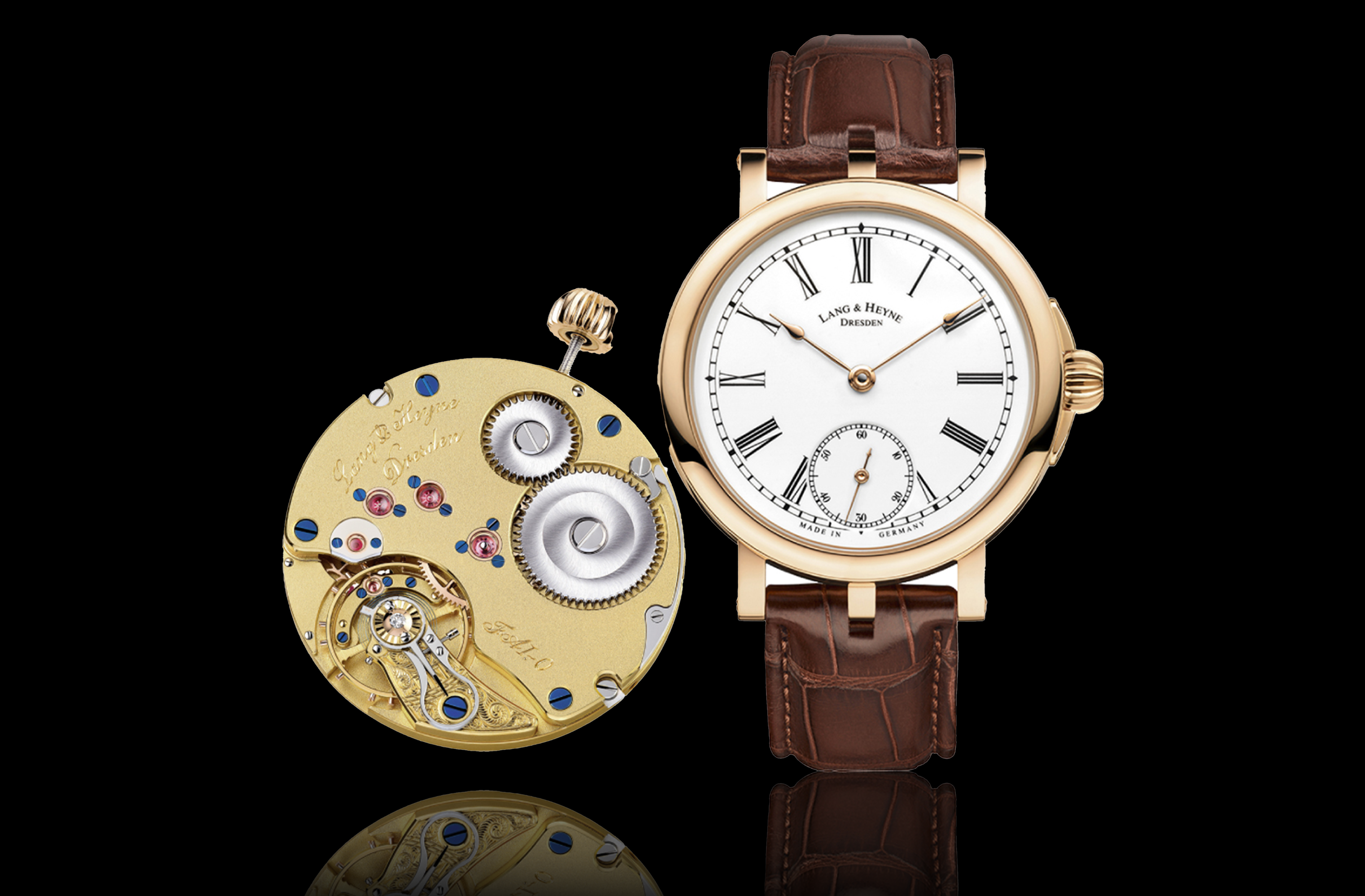 The bipartite dial is available with a classical white enamel dial or with a galvanic black dial in solid silver.