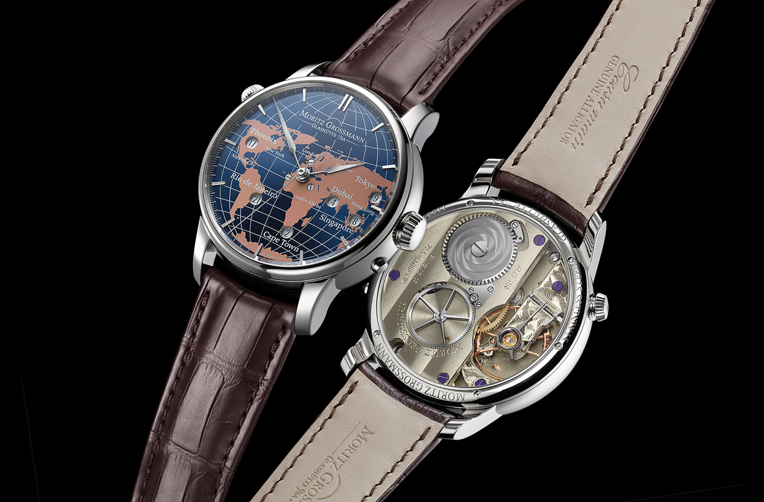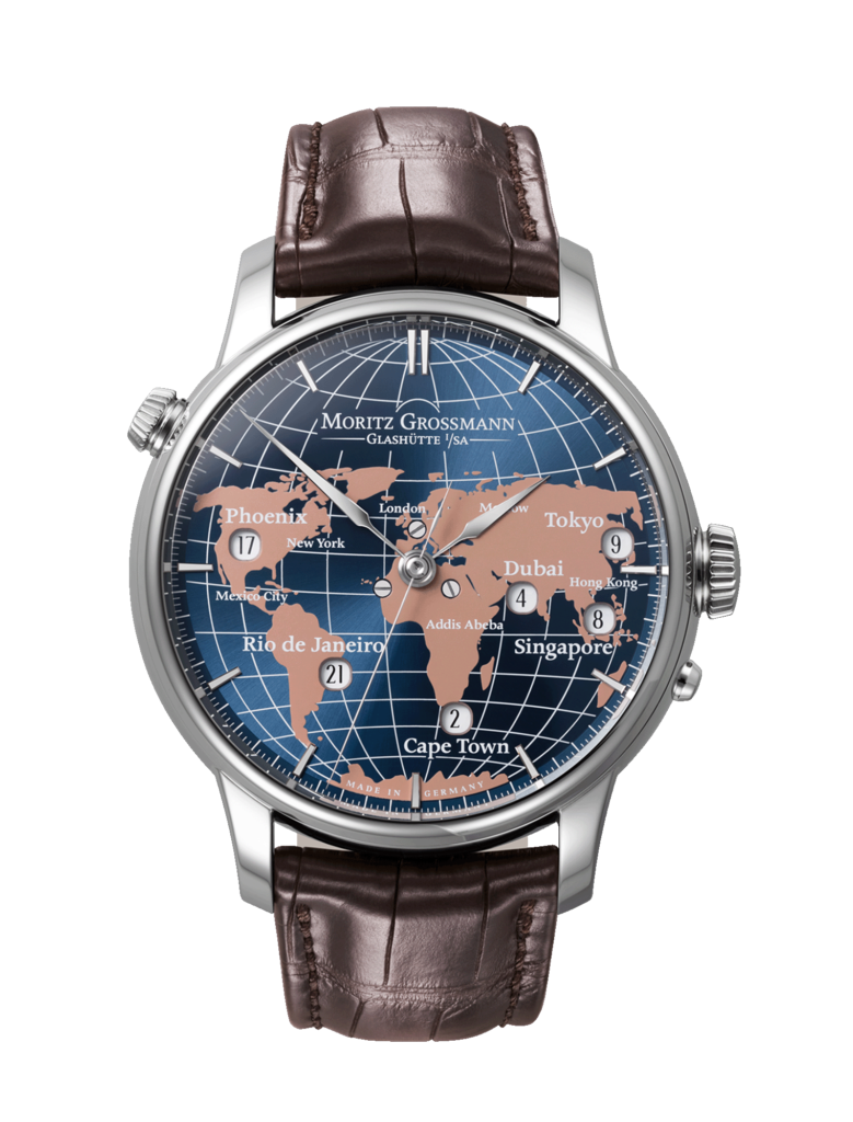The Universalzeit makes it possible to see the current time in several time zones at a single glance. Designed in the shape of a world map, the dial uses time windows precisely aligned with coordinates and city names in order to provide orientation.
