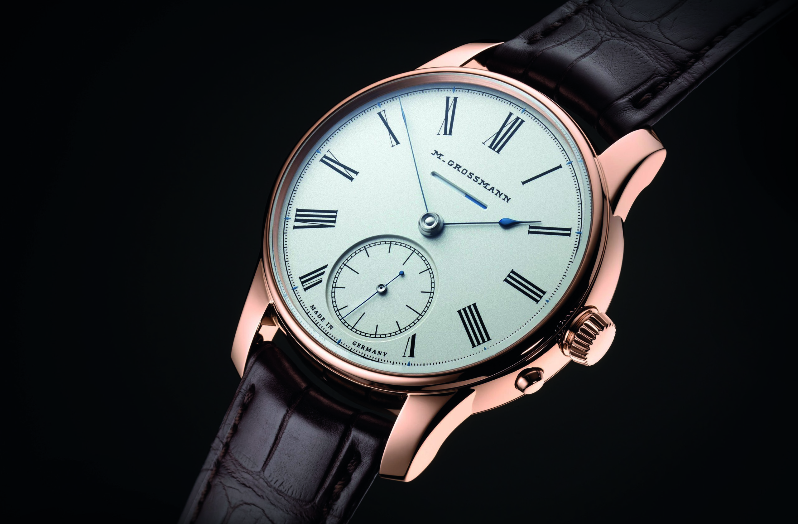 Finely crafted Roman numerals in black and the original logo featuring the "M. GROSSMANN" typography frpm 1875 grace the dial paying tribute to the master, as he was respectfully called in Glashütte. A symbolic display in the form of a filigree bar indicator informs of the remaining power reserve.