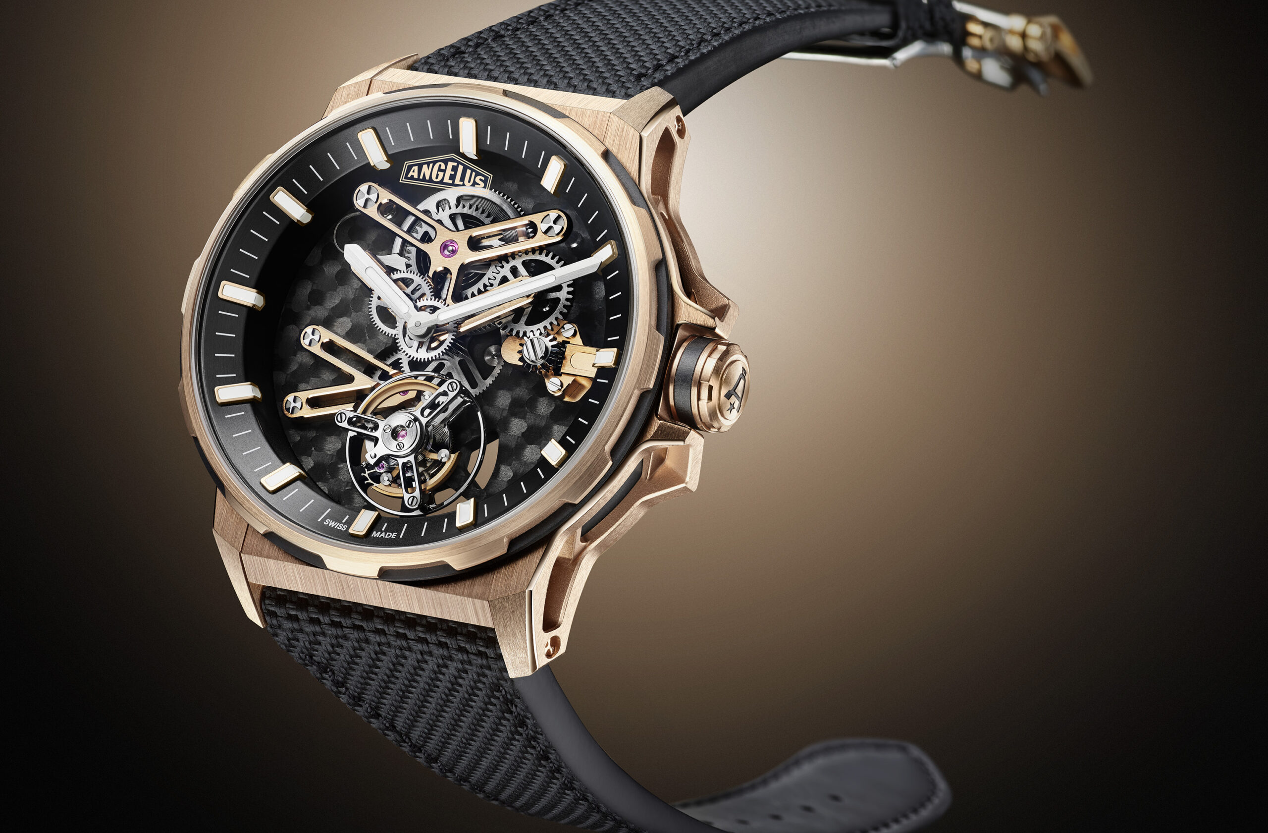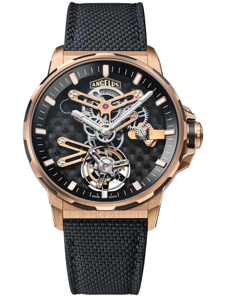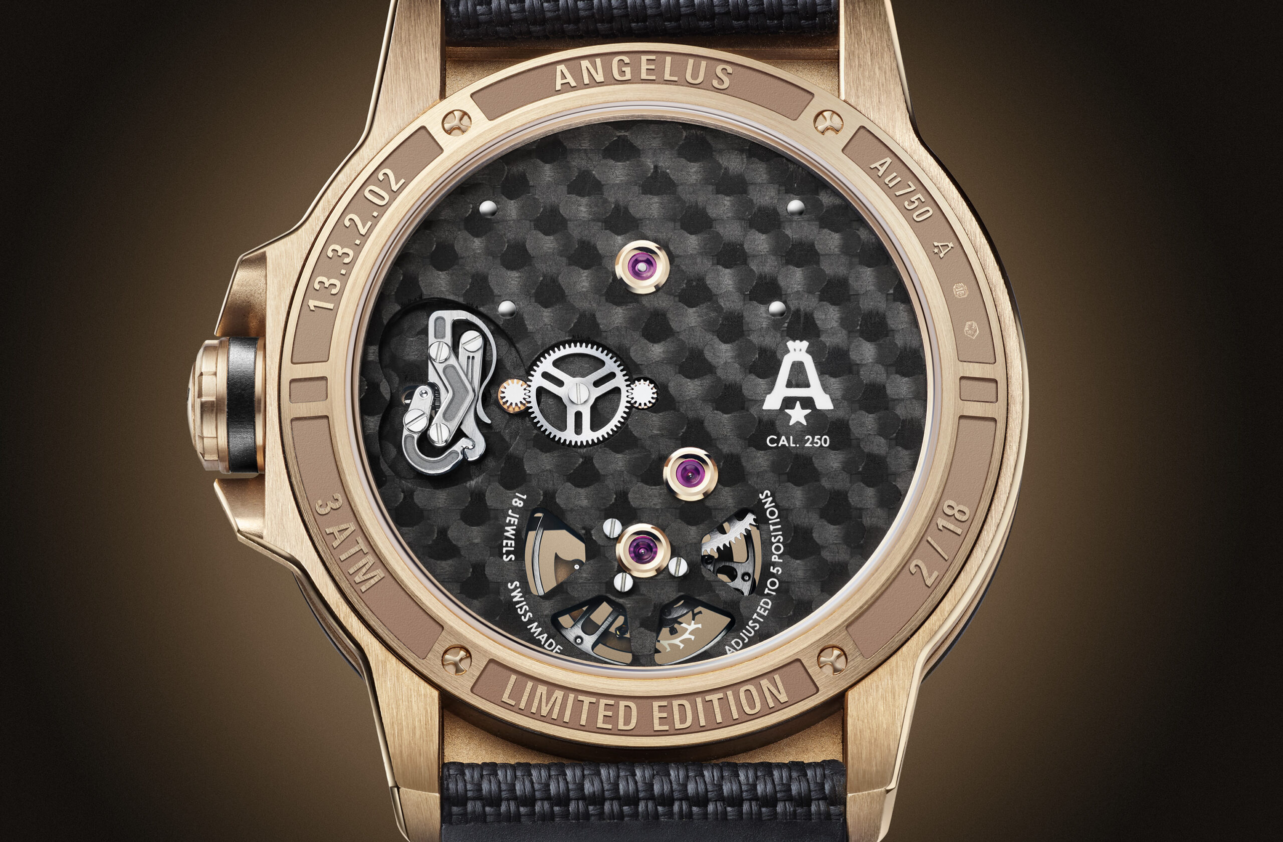 The bridges form its face. In the absence of a dial, these components play an expressive role in any skeleton movement. Since the main plate of the calibre is made from woven carbon composite, it is black, accentuating the contrasting 18K red gold bridges.
