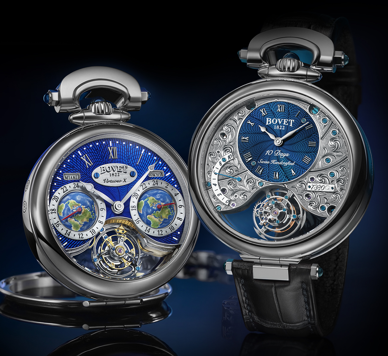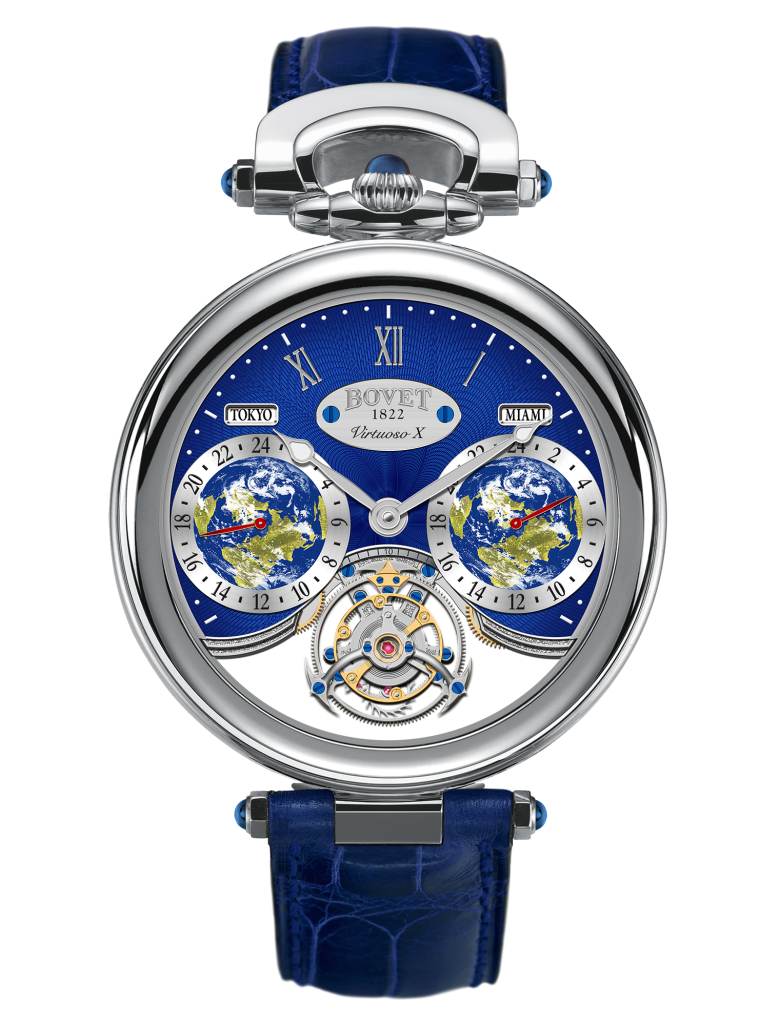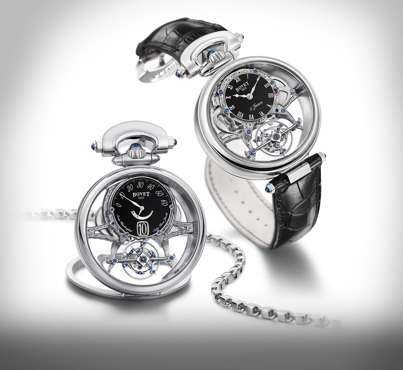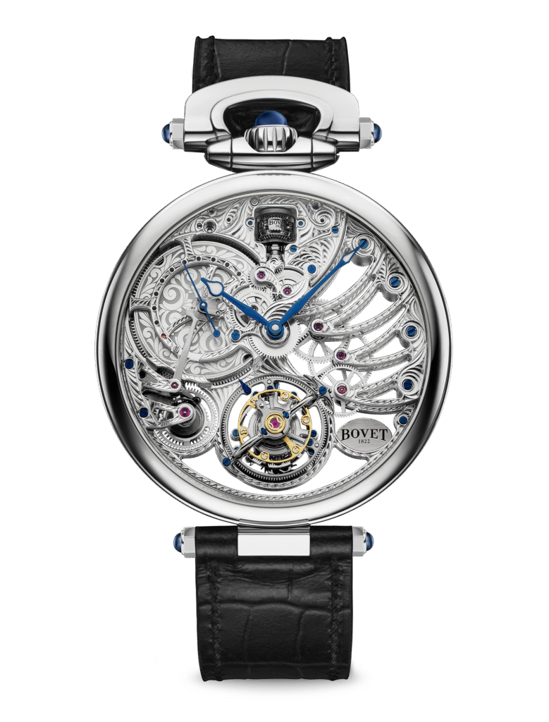 Inspired by pocket watches BOVET created in the 1800s, the Fleurier Collection features the crown and bow at 12 o'clock. Some of the Fleurier timepieces use the Amadeo System, which allows them to be worn on either side, converted into a pocket watch and a table clock, without any tools.