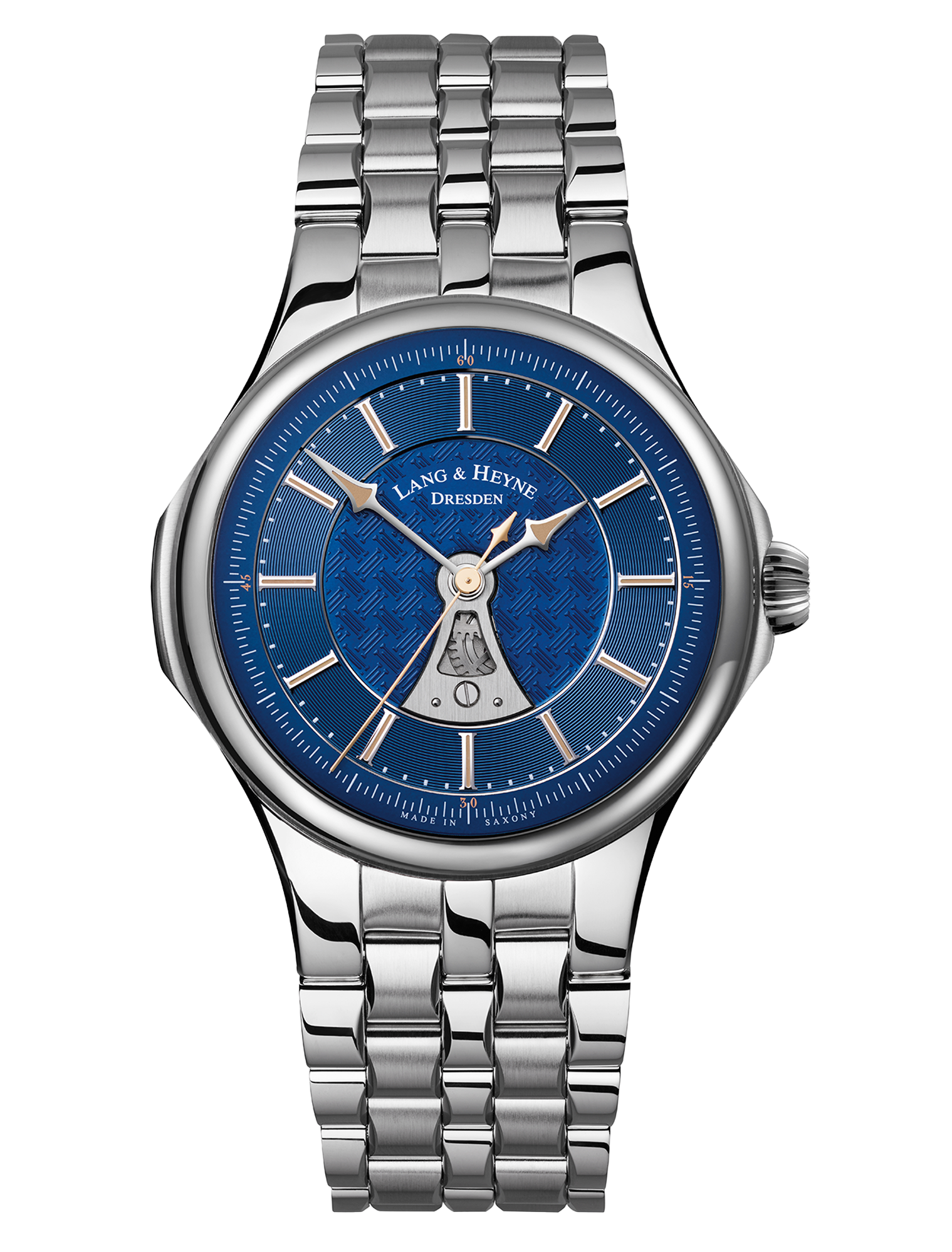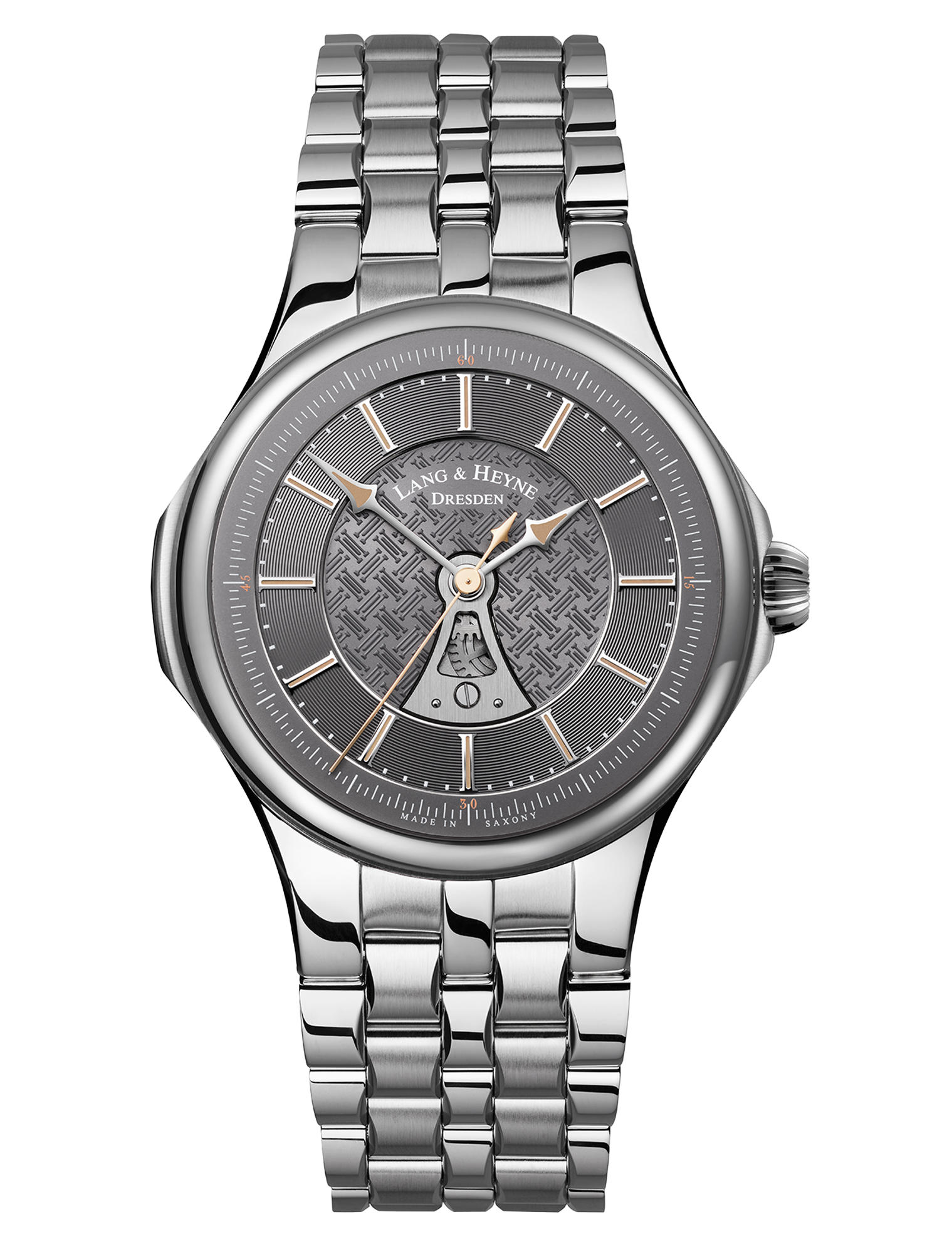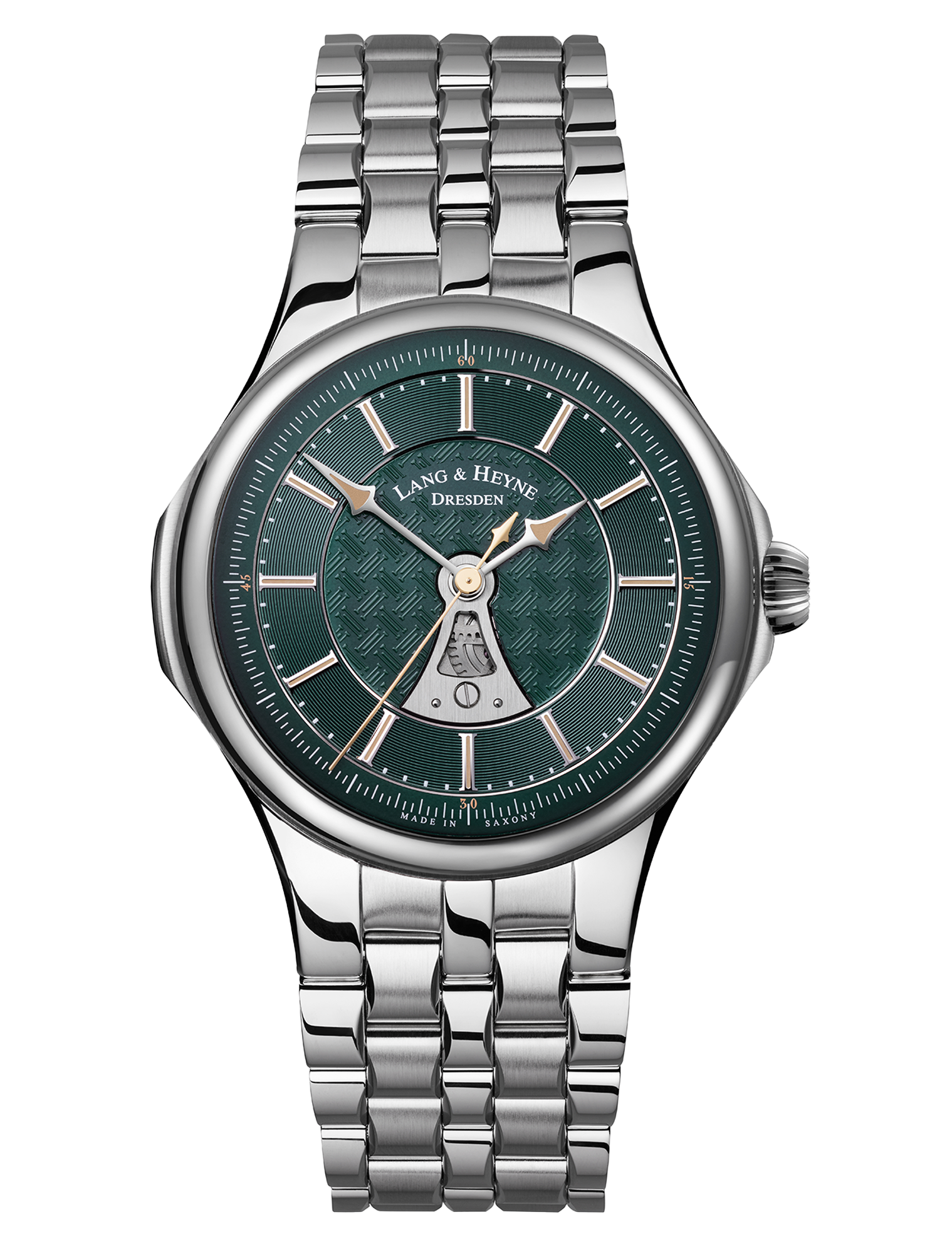 The movement, which was developed and installed for the first time for this model with sweep seconds, becomes visible through an opening on the dial. The full beauty of this newly developed manufactory movement is revealed, as with every LANG & HEYNE, in the anti-reflective sapphire glass back.