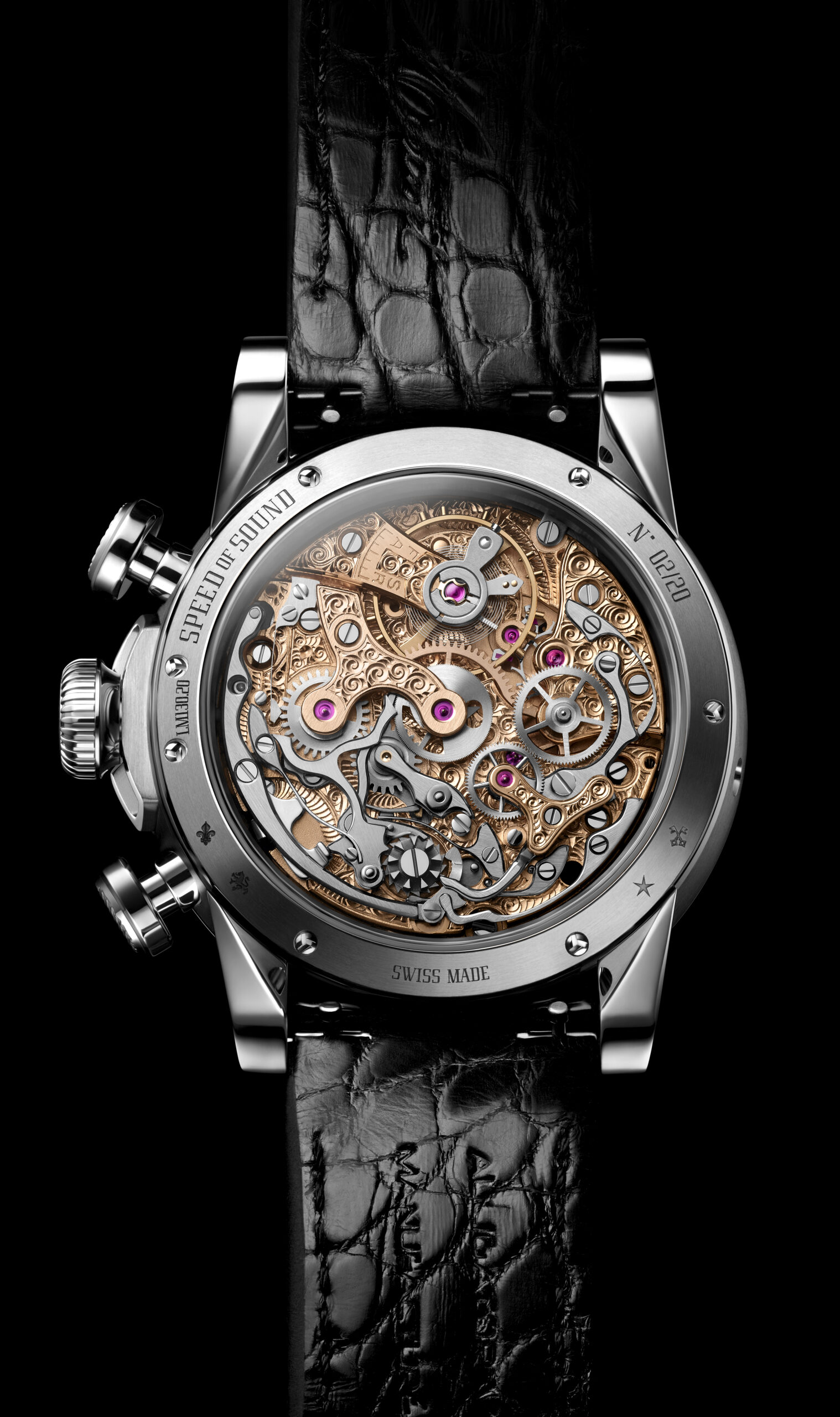 Named for its function, the SPEED OF SOUND chronograph features a special scale that displays the speed of sound by measuring the distance of an audible event. Taking centre stage is a moonphase indication that has been entirely reimagined, offering a display never before seen in watchmaking.